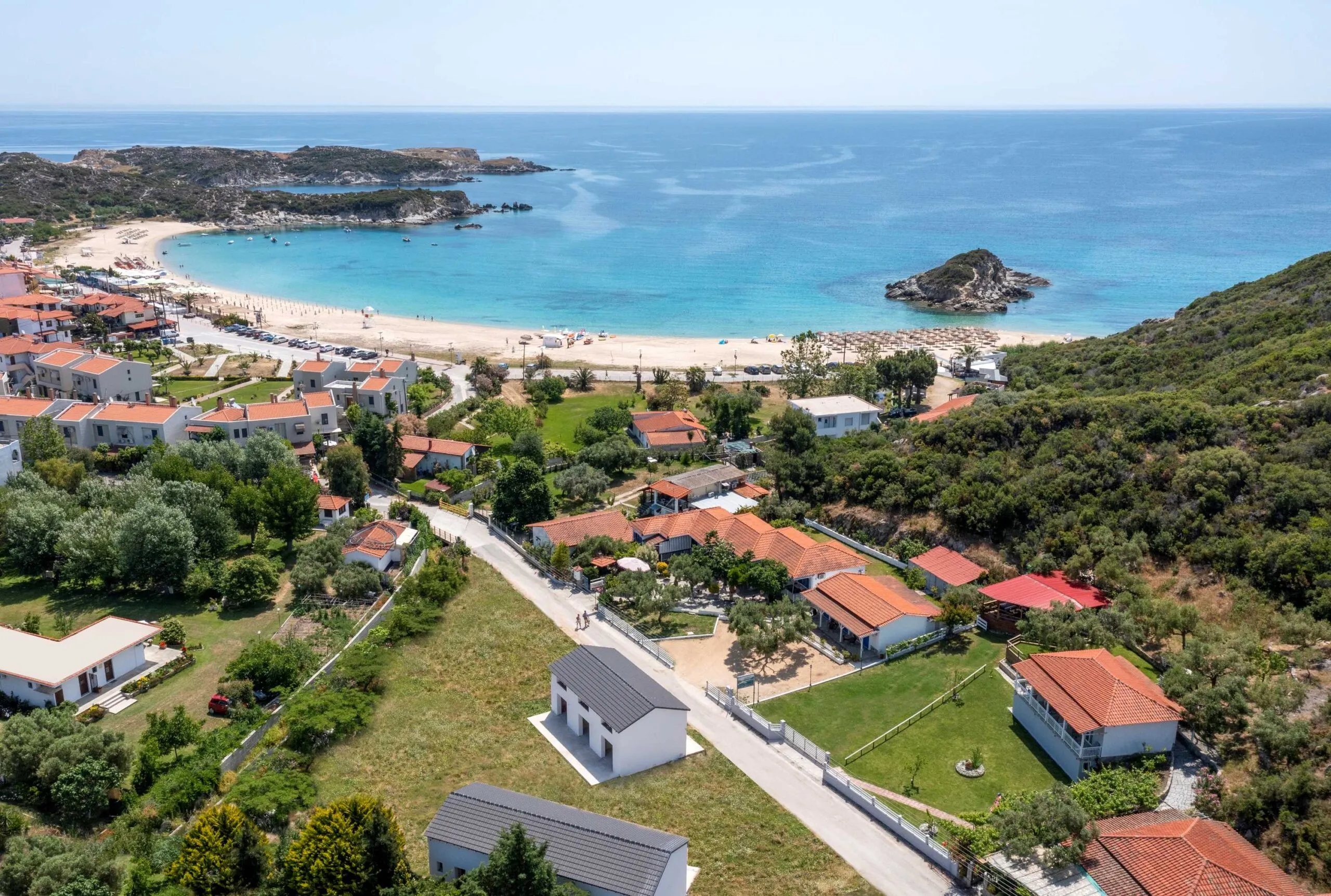 Arroyo Suites е съвсем нов комплекс от четири мезонета, който предлага модерно и комфортно настаняване в красивото селище Каламици, Халкидики. Построен през 2023 г., той се намира само на 100 метра от морето и живописната пешеходна зона на селото. Всяка мезонета разполага с просторна всекидневна, напълно оборудвана кухня, баня с душ и таванско помещение с двойно легло, съчетавайки функционалност и естетика. Плажът с кристално чистите води и характерното островче в далечината създава уникален пейзаж за релаксация и разходки. Наблизо ще намерите таверни, кафенета, плажни барове, но и дейности като водни спортове и гмуркане, които добавят специални преживявания към вашата почивка.