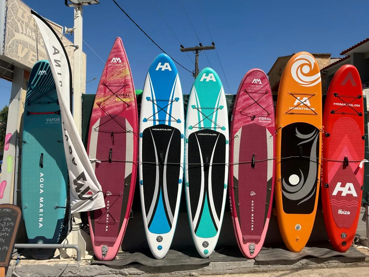 În plus, suntem singurul magazin din Halkidiki care oferă SUP (Stand Up Paddle) cu o gamă largă de modele și tot echipamentul necesar. Lucrăm cu cele mai distinse companii, cum ar fi Aqua Marina și Homethlon, asigurând cele mai mici prețuri de pe piața greacă.
